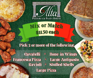 Daily Special: Mix and Match- $11.50 each. Pick 2 or more of the following: Cavatelli, Francesca Pizza, Ravioli, Large Pizza, Bone-in Wings, Large Antipasto, Stuffed Shells